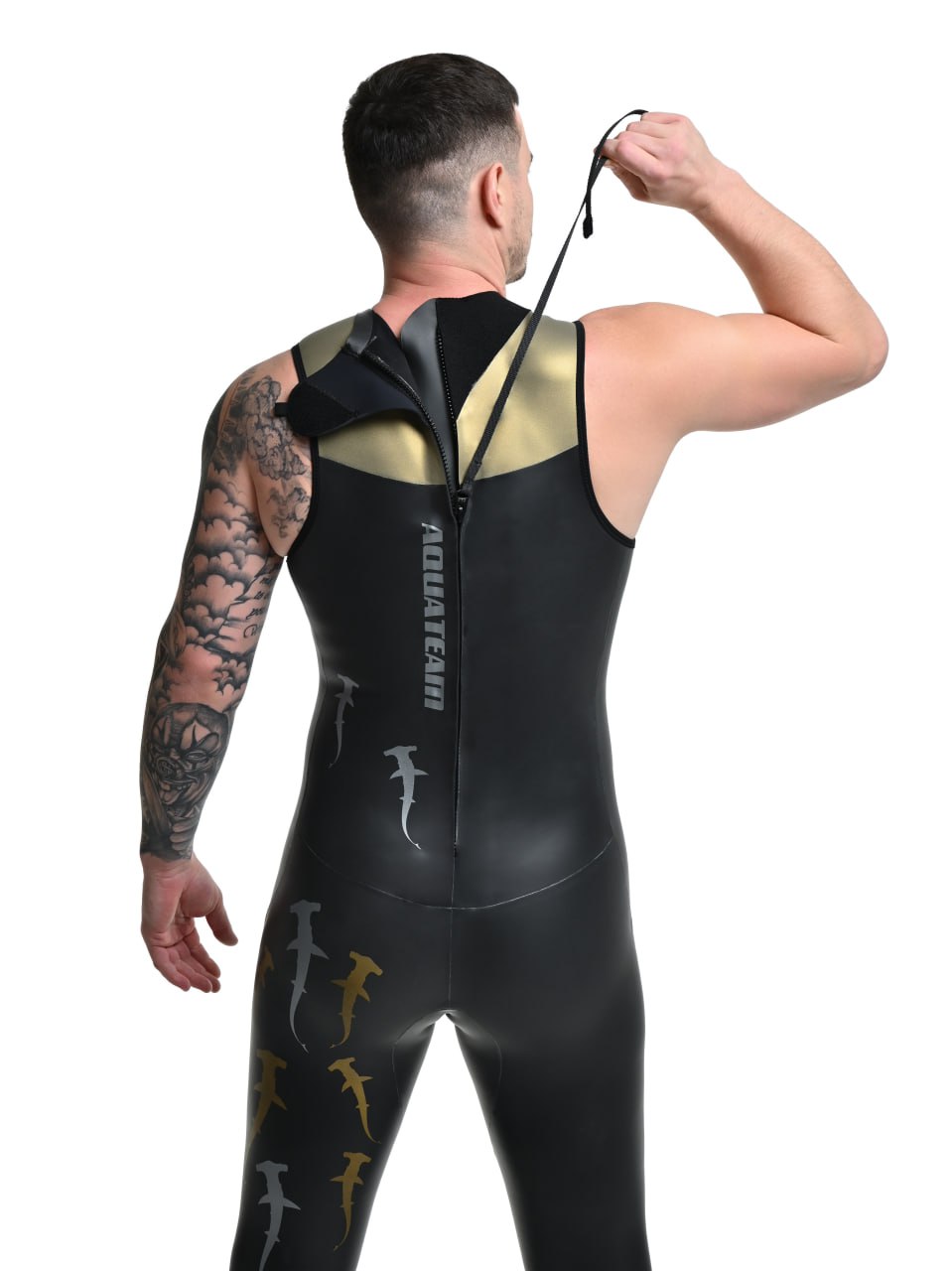 Гидрокостюм оснащен застежкой на спине «тесьма-молния», дополненной планкой для защиты кожи от натираний. Это обеспечивает не только практичность, но и дополнительный комфорт при надевании и снятии костюма.